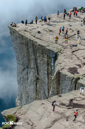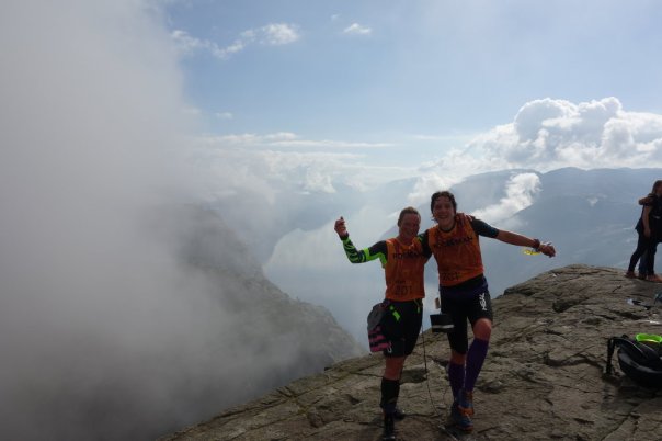 Then a series of short swims and runs, a slight disagreement about which way around a tree to go and a kerfuffle when Marie’s belt fell off (not for the last time in the race!). This section was otherwise uneventful! Then it was the start of an 8km run up to the famous ‘Preikestolen‘ (or ‘Pulpit Rock’) and back down again.