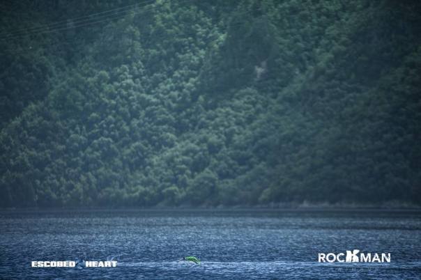 In this way we arrived at the next long swim, 1600m along the fjord next to the rock face. I wasn’t sure where to aim and set my sights directly on a point I thought we had to go round. We overtook many teams here, some hugging the coast, some out near us. We’d been warned about the nippy red jellyfish, but I only saw a few, floating deep beneath us. Just as I started to feel a bit cold I spied a banner just before the point and we got out.