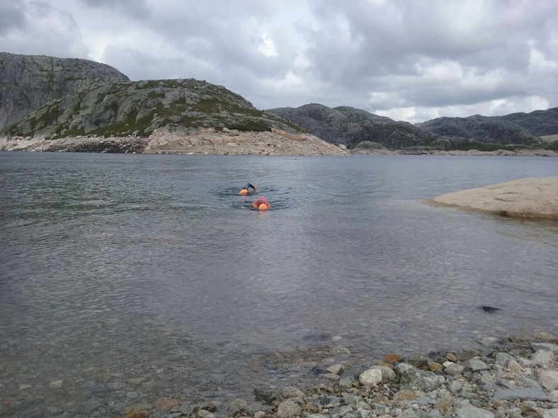 Racers completing the final swim leg