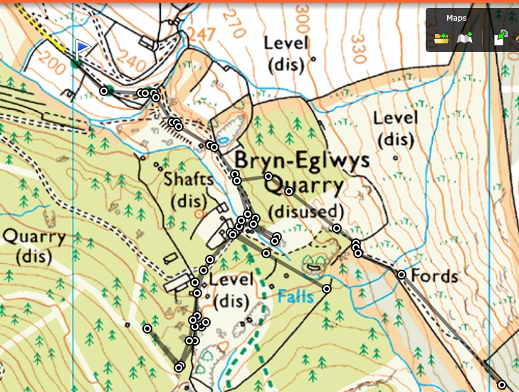 In the Bryn Eglwys quary, we got stuck for about an hour. Back at home, with the help of my dad I overlaid our track on the map. It looked like this: